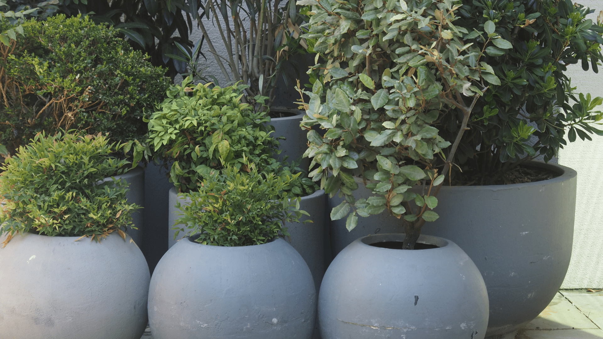 • Oversized round planters that create a strong focal point on open sidewalks